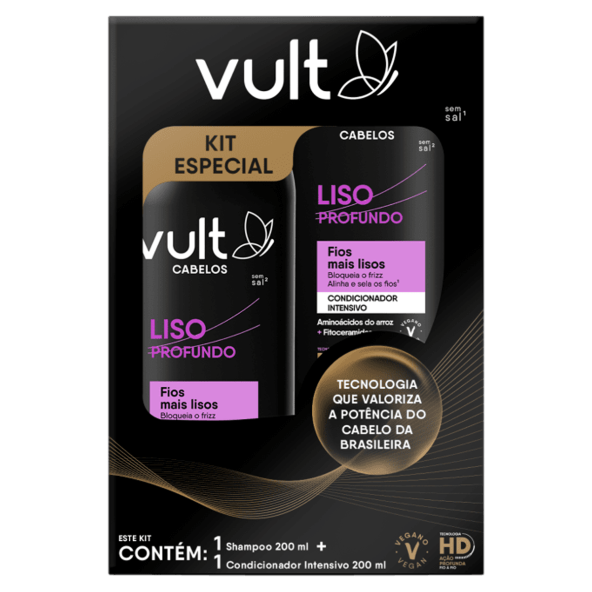 Com nova fórmula desenvolvida com Tecnologia HD, que é um sistema inteligente composto por aminoácidos reconhecidos pelo alto potencial reparador que agem profundamente fio a fio, o Combo Vult Cabelos Liso Profundo valoriza seu cabelo e te incentiva a cuidar dos seus fios, manifestando a beleza única que eles têm: